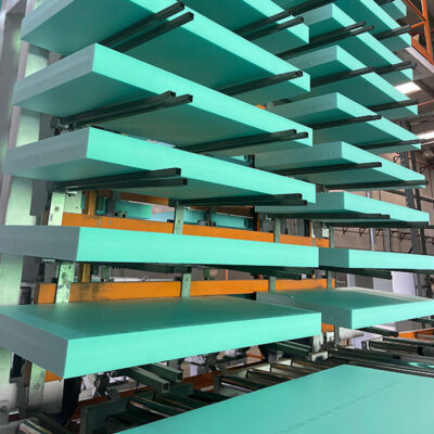 The production process of extruded Polystyrene insulation boards begin as a solid granule. The granules are fed into an extruder where they are heated at very high temperatures until molten. Critical additives are mixed with the viscous fluid that is formed. Then, a blowing agent is injected to make the mixture that is foam able. Under carefully controlled temperature and pressure conditions, the foamable mixture is forced through a die, at which the forming and shaping occurs. The rigid foam is then trimmed to the final product dimensions. The polystyrene sheets are then packed and stacked on wooden pallets for easy handling and loading. The cut pieces are further trimmed into slices and granules, which are regrinding and reused with virgin polystyrene granulate making this as zero wastage there by a complete green project.